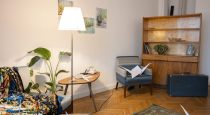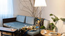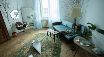 3)Гостиная - зал состоящий из двух комнат. Минималистичный фон с акцентными элементами: деревянный комод, кресла, ретро-лампа, ковер, журнальный столик и зеркало. Подойдёт для интервью, контента, портретов и съёмки одежды. + Столовая зона у панорамных окон.