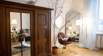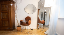 Во второй — винтажная тумба с зеркалом, напольное зеркало, вешалка, огромный комод и свет. Здесь удобно как снимать, так и готовиться к съёмке.