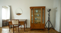 В одной из комнат — винтажный обеденный стол с посудой, старинные часы и шифоньер, идеальные для уютных съёмок в стиле завтрака, семейной фотосессии, fashion и сторителлинга.