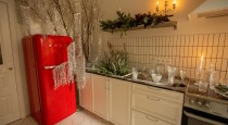 • Красочный интерьер с культовыми акцентами (ретро-холодильник, открытая полка с посудой, плитка «кабанчик»)