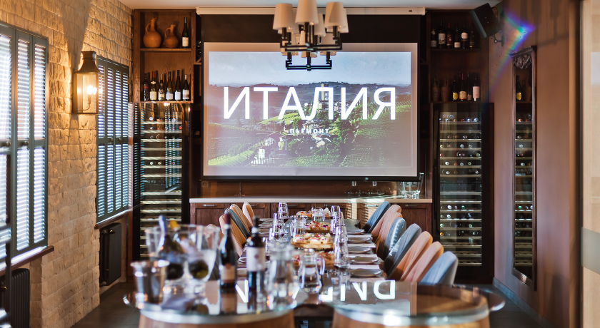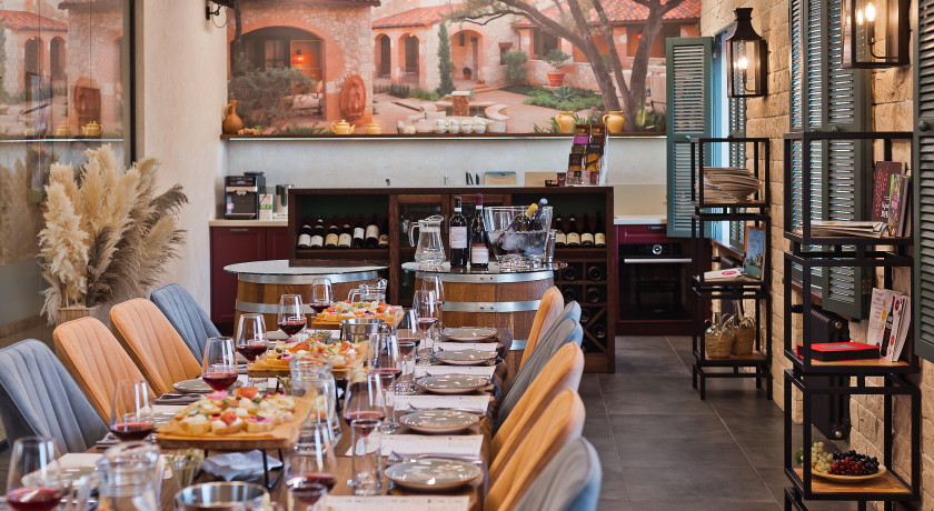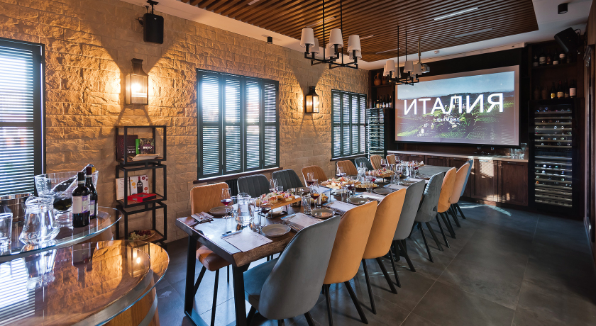 Важными элементами интерьера, придающими обстановке особый уют, являются винные бочки с завода из Краснодарского края, шкафы для хранения вин ручной работы, столы из слэба дерева Карагач, настенные фонари и потолочные светильники, окна с изящными ставнями, изысканные аксессуары, бокалы и посуда.