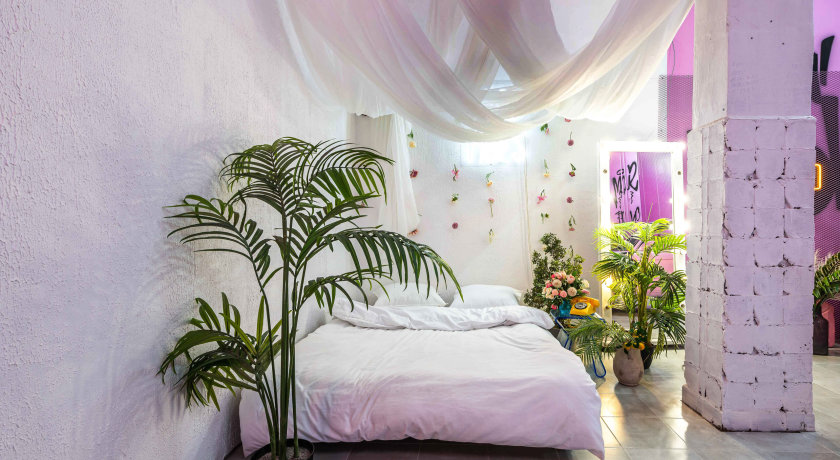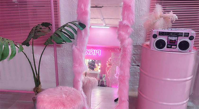 Розовые барные и обычные стулья, фиолетовый кактус и даже розовый скелет — всё здесь для тех, кто хочет выделяться и удивлять. Мягкие меховые пледы и розовый телевизор — детали, которые делают атмосферу комфортной и по-настоящему уникальной;