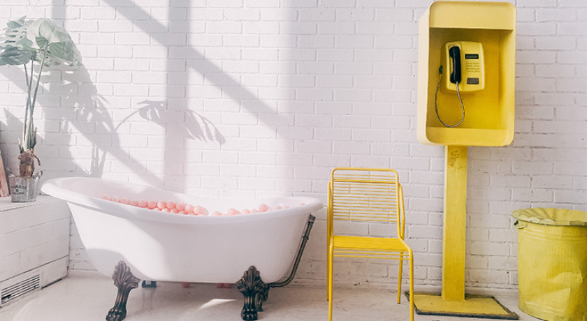 Идеальный баланс — белая стена с воздушной белой кроватью, украшенной цветами и лёгкой тканью, а рядом — белая ванна, наполненная шариками для ярких и нежных кадров.