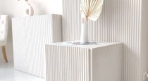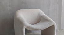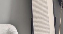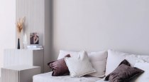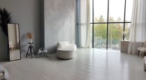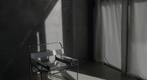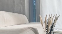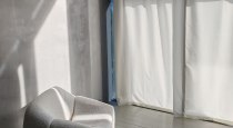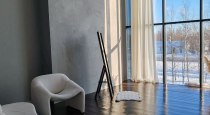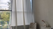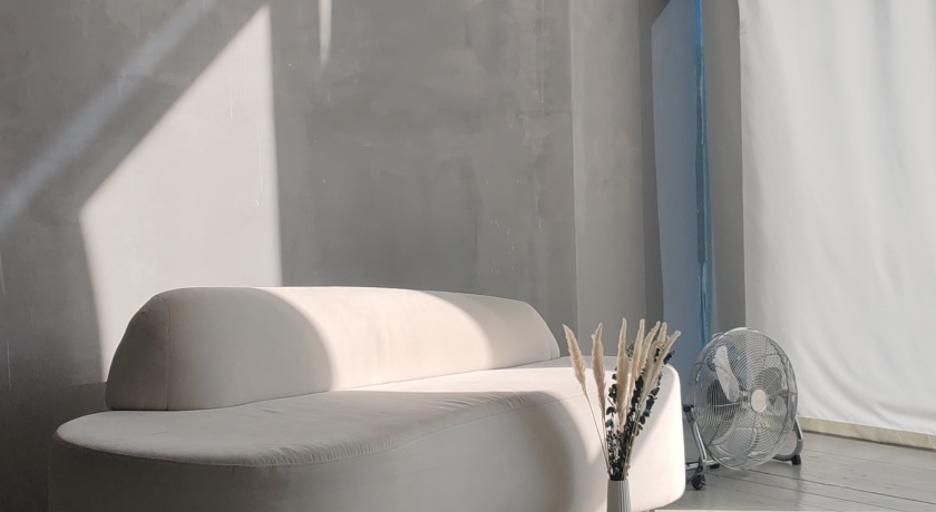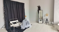 Светлый интерьер, одна сторона студии выполнена в сером стиле, другая - в бежевом. Минималистичный, аккуратный дизайн, дополненный предметами интерьера, которые можно использовать в съемках. Имеется стойка с черным тканевым фотофоном для портретных и художественных фото. Большие, панорамные окна с белыми шторами.