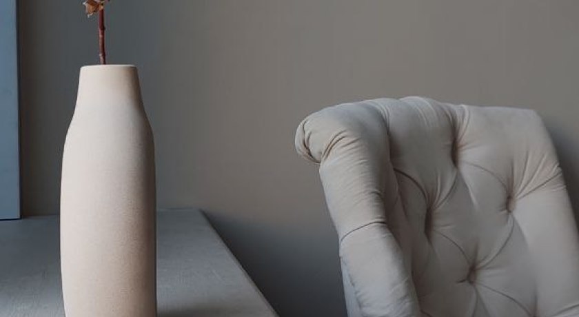 Светлый интерьер, одна сторона студии выполнена в сером стиле, другая - в бежевом. Минималистичный, аккуратный дизайн, дополненный предметами интерьера, которые можно использовать в съемках. Имеется стойка с черным тканевым фотофоном для портретных и художественных фото. Большие, панорамные окна с белыми шторами.