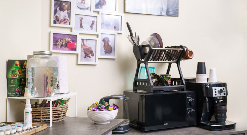 Бесплатные кофе, конфентки, вода и чай. Есть микроволновка