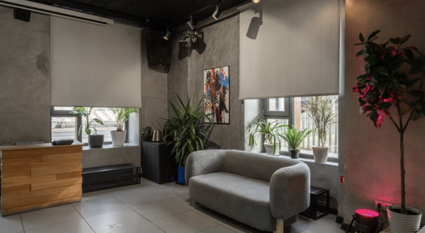 80 м² с большими окнами и естественным светом — отличное место для фотосессий, видеосъёмок и камерных мероприятий. Интерьер выполнен с акцентами на уютных диванах, коврах и зелени.
