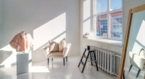 Вешалка для одежды, Гриммерный стол, Диван, Зеркало, Окно, Стол, Стул, Шторы