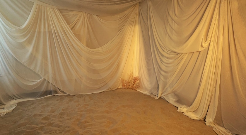 Пол: Натуральный песок, создающий естественный свет и приятную текстуру на фото.