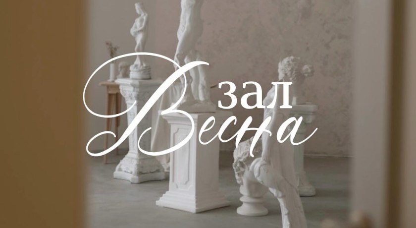 Зал «Весна» — античные пьедесталы с капителями, скульптуры, фактурные стены, хрустальные люстры, стол, лестница