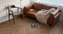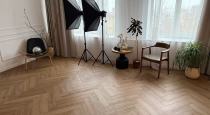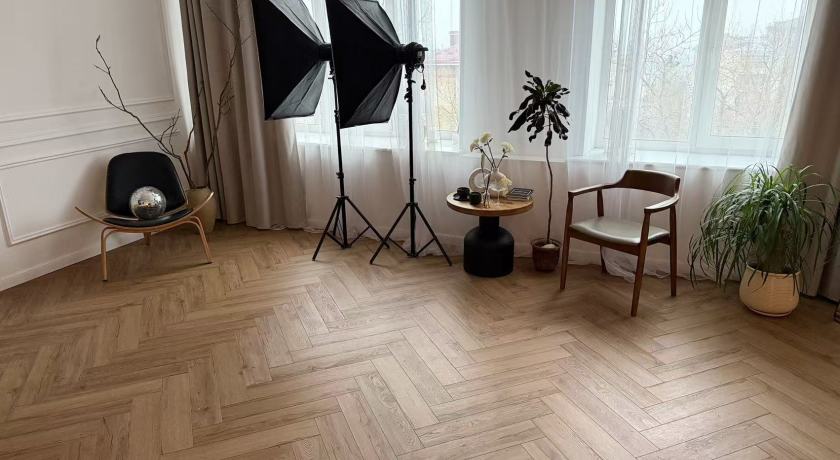 В пространстве светлые фактурные стены, дубовый пол, уложенный “французской елочкой”, стена под дерево. Дизайнерская мебель, тканевые и бумажные фоны. Живые цветы.