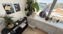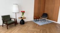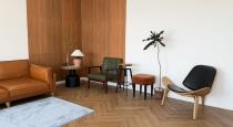 32 кв. метра представляет собой минималистичный интерьерный зал с дизайнерской мебелью в стиле апартаментов/офиса.