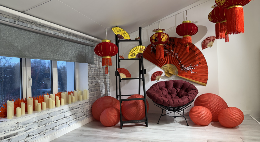 Контрастная фотозона в красных и золотых оттенках, с азиатскими фонарями, веерами и выразительным декором.