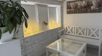 В зале установлен большой 86″ телевизор, который можно использовать как фон, для демонстрации презентаций, видео, логотипов или интерфейсов. Удобный кожаный диван, два дизайнерских кресла и кофейный столик позволяют легко выстраивать разные композиции кадра — от камерных разговорных форматов до динамичных видео-сцен.