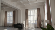Два больших окна наполняют зал естественным светом, а световые волны с подсветкой добавляют уникальные световые эффекты и атмосферу, делая съемки особенно выразительными. Стена с молдингами мягкий диван, тумба и кресло, которые создают уютную обстановку для моделей и фотосессий в разной стилистике.