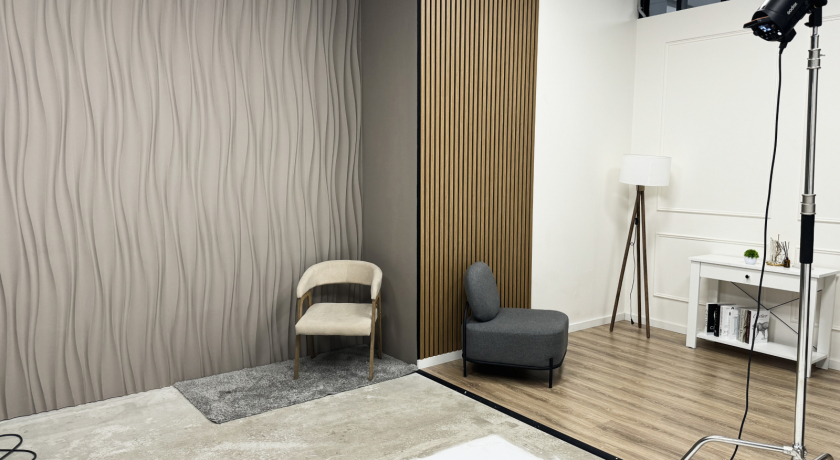 • Локации зала: белая локация, детская комната, спальня, парковка, бетонная стена, стол для предметной съёмки