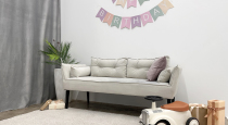 5. Классическая фотозона с серой стеной с молдингом, диванчиком, ковром, кофейным столиком, ростовым зеркалом.