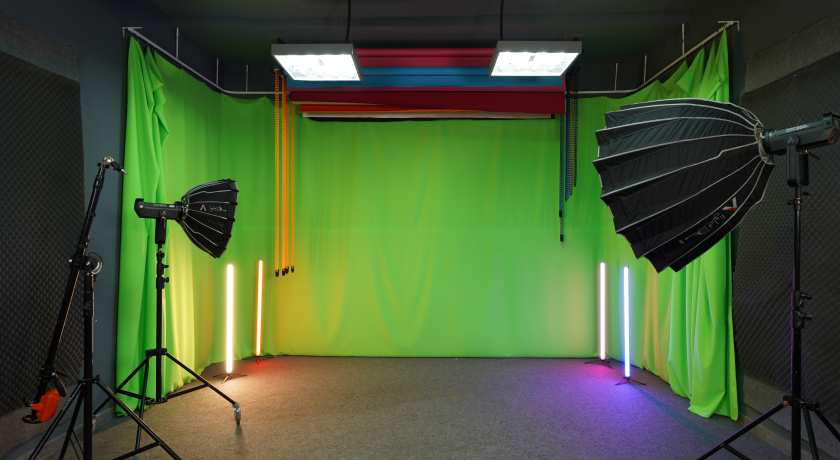 Просторный зал площадью 35 кв. метров с качественным зеленым фоном (хромакей), обеспечивающий удобство постобработки. Помимо классического хромакея, в студии есть бумажные фотофоны для портретной, предметной и fashion-съемки.