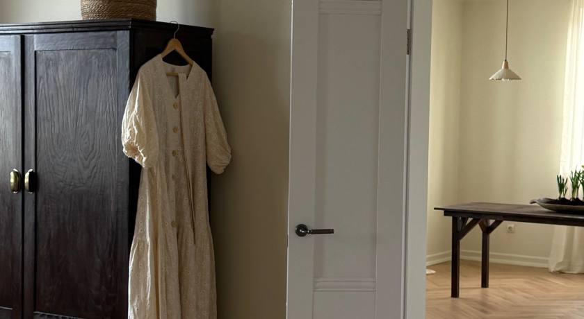 Первый зал: светлые стены, распашные двери, пол в елочку. Есть диван и деревянный шкаф, заполненный вещами для сьемок.