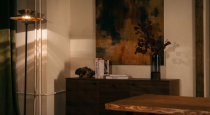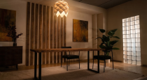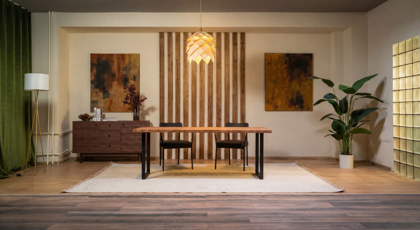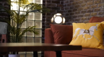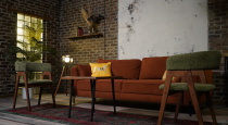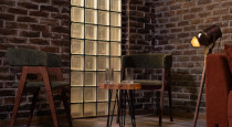 Камерная зона в стиле лофт расположенная в общем зале — идеальна для подкастов, интервью и разговорных форматов. Тёплый свет, акцентная люстра и фактурные стены создают ощущение уюта и доверия в кадре.