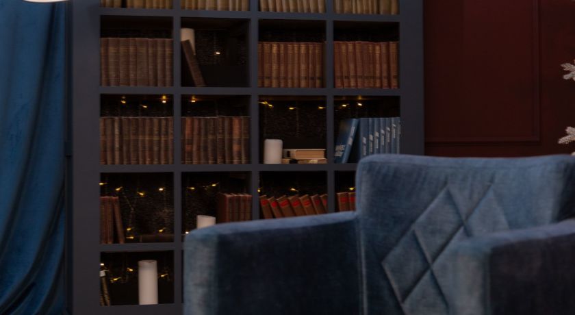 Декорации, Диван, Журнальный столик, Камин, Книжный шкаф, Кресло, Люстра, Шторы