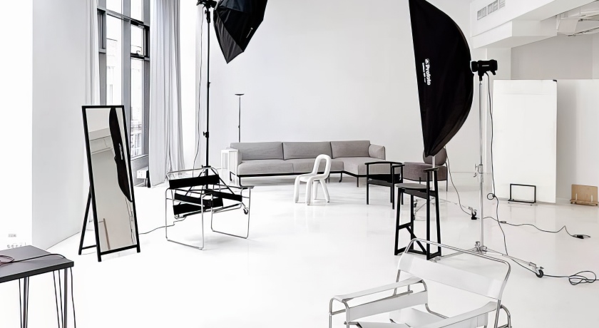 Пространство оснащено мансардным окном, пропускающим максимум естественного света, санузлом с душем, шторами блэкаут и тремя источниками Profoto D1 500, что гарантирует технологичность и комфорт съемки.