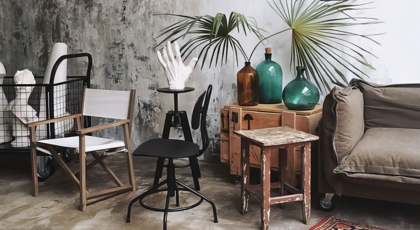 От каждой детали здесь словно веет духом искусства, а винтажная мебель, элементы декора, ткани и фактуры – все это по-особому глубоко раскрывается в атмосфере творчества, царящей в стенах зала, создавая особый неповторимый шарм. Пространство выдержано в серых тонах, а бетонный пол в сочетании с множеством живых растений и реплик античных скульптур создает невероятно красивый и манящий контраст между эстетичной небрежностью элегантностью.