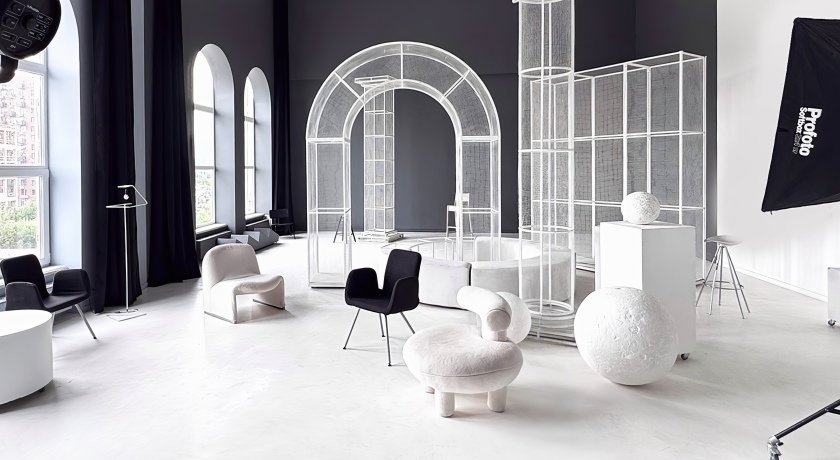 Все элементы декора легко передвигаются для абсолютного комфорта во время творческого процесса, а также зал располагает тремя источниками Profoto D1 500, блэкаут шторами, гримерным столом и высоким мансардным окном.