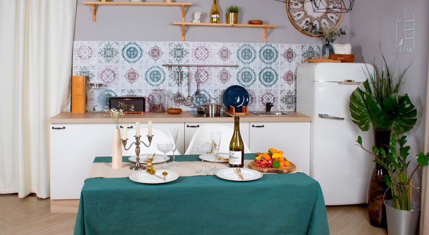 На полу ламинат и ковры c рисунком и без. Зал включает в себя 4 фотозоны. Это интерьеры имитации квартиры, которые подойдут под любую съемку. Кухня, гостиная, рустик веранда
