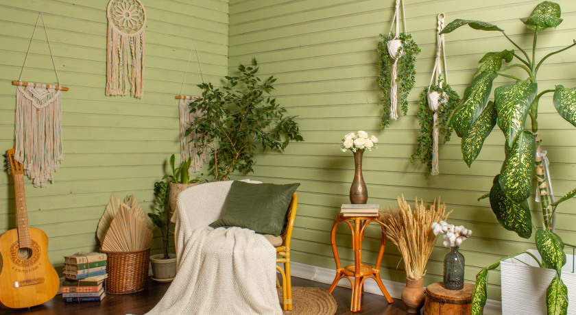 Стены разной фактуры (обои ретро, штукатурка, зеленый);