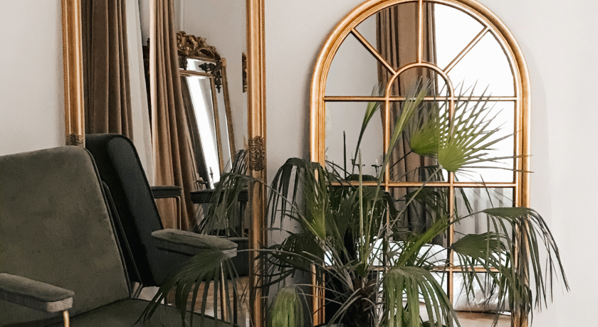 Большое светлое пространство с шестиметровыми потолками и семью окнами, расположенными полукругом. Деревянный пол и подиум с плиточным полом, отделенный четырьмя массивными дорическими колоннами. Общая площадь пространства 100 кв. м. Из мебели в зале изумрудный бархатный диван, латунная итальянская кровать, стулья винтажные и модерн, сервированный стол, 2 винтажных напольных зеркала.