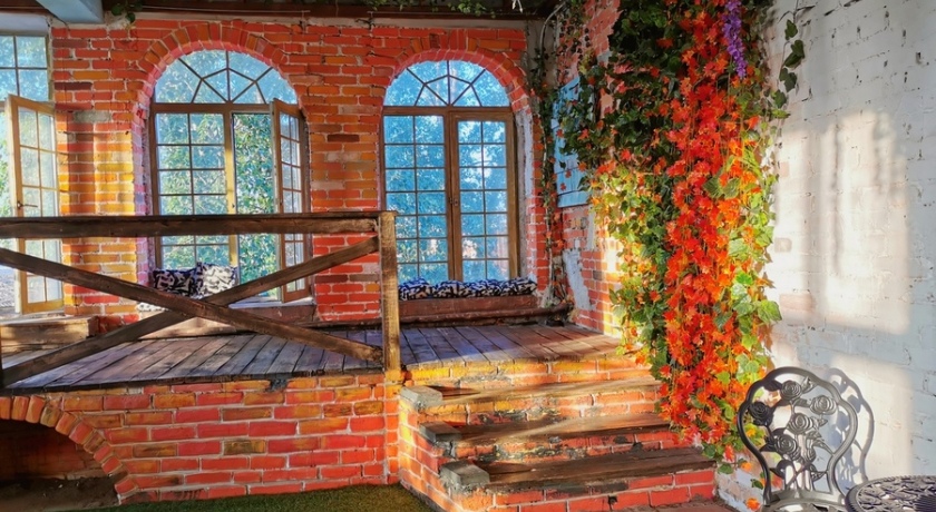 Терраса из состаренного дерева, огромные цветущие деревья, «дворик» с кованным столом и стульями, дорожки из натурального камня, сквозь который пробивается настоящая травка, качели в арке с цветами…