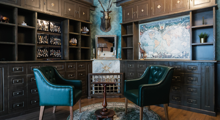Бар выполнен в лондонском стиле с оригинальными художественными решениями в виде ретро реквизита и картин.