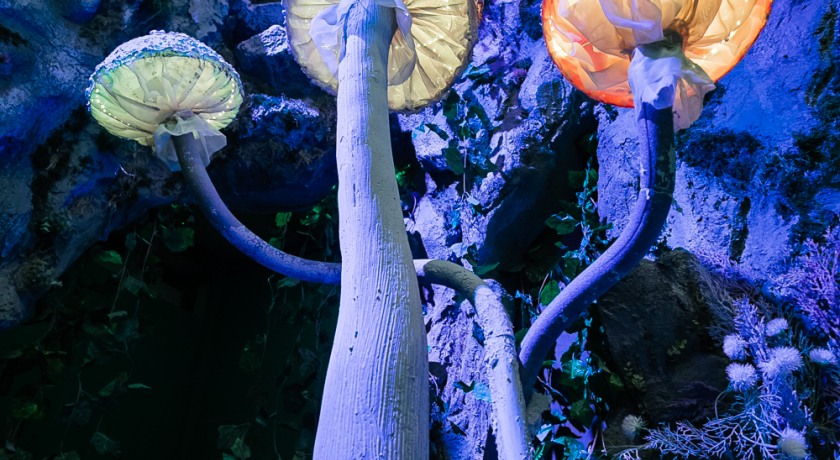 Изюминкой декорации стали подсвечивающиеся гигантские грибы и насекомые. А на сказочной поляне мы расположили столы и посуду для чаепития Шляпника.