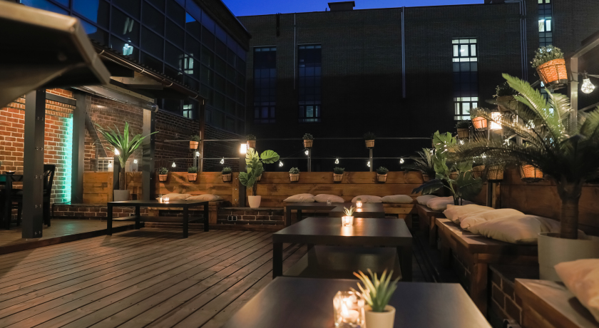 На террасе барная стойка , раковина с подачей воды, 4 барных стула, 7 столов, стулья, сидения с подушками, декоративная зелень, яркая подсветка, меняющая цвета, звуковое оборудование, плазменный телевизор.