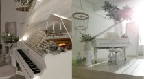 — подиум с белым винтажным роялем, огромным зеркалом и хрустальными люстрами