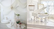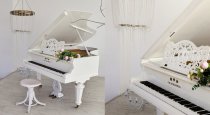 — подиум с белым винтажным роялем, огромным зеркалом и хрустальными люстрами