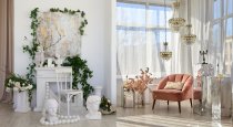 Антикварная мебель, Зеркало, Комод, Кресло, Кровать, Люстра, Подвесное кресло, Подиум, Стол, Цветы, Шторы