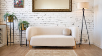 - серый диван с подушками, картинами и торшером, настенное классическое зеркало,