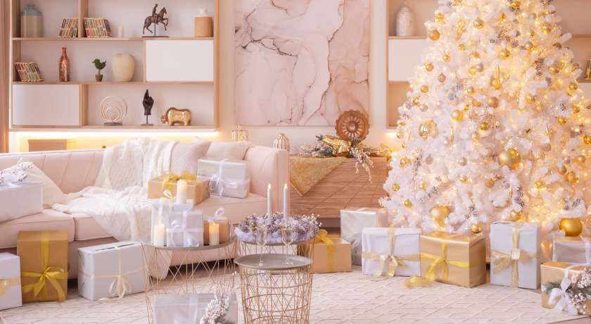 На данный момент зал имеет новогодние декорации — высокую елку на колесах, гирлянду на камине и декор на столе.