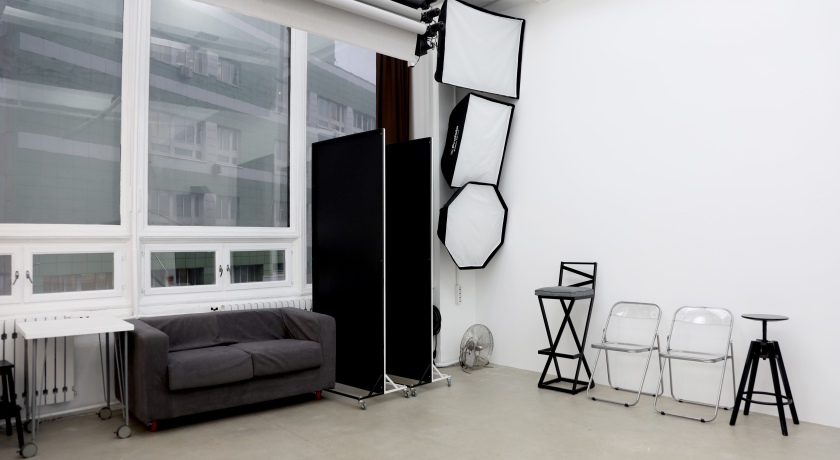 - Зал выполнен в минималистичном стиле. Циклорама + фактурные стены + мебель + бумажные фоны.