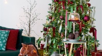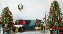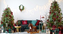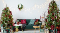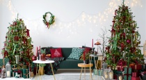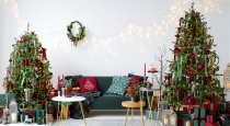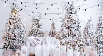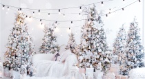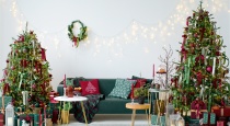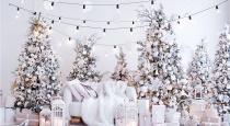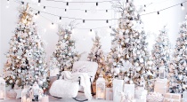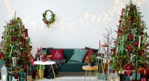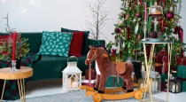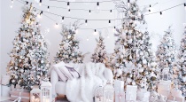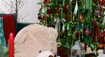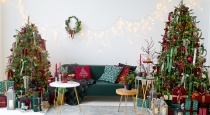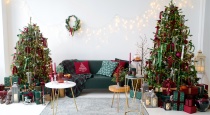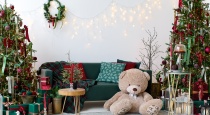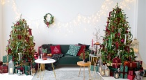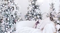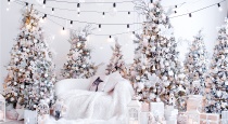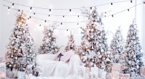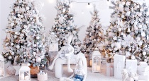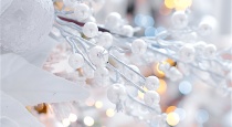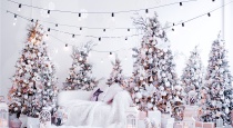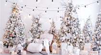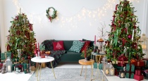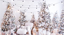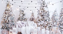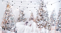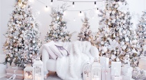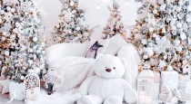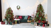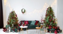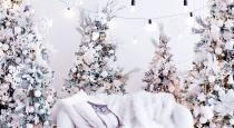 - Мебель молочного оттенка букле: диваны, кресла, табуреты и журнальный столик собраны в отдельный "уголок" для съёмок в левой части зала у окна. В этой зоне есть вазы с сухостоем и пампасной травой, плетёные корзины, а также большое ростовое напольное зеркало фигурной формы. А также деревянный ажурный куб,
