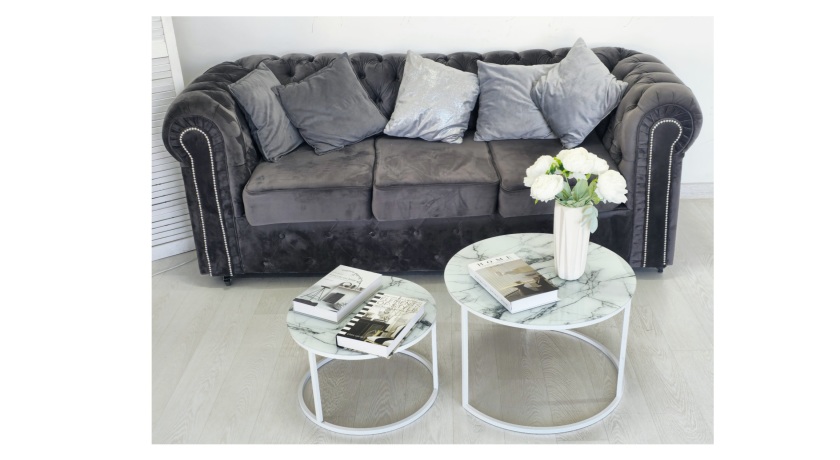 - большой белый стеллаж с декором, журнальные столики, серое кресло;