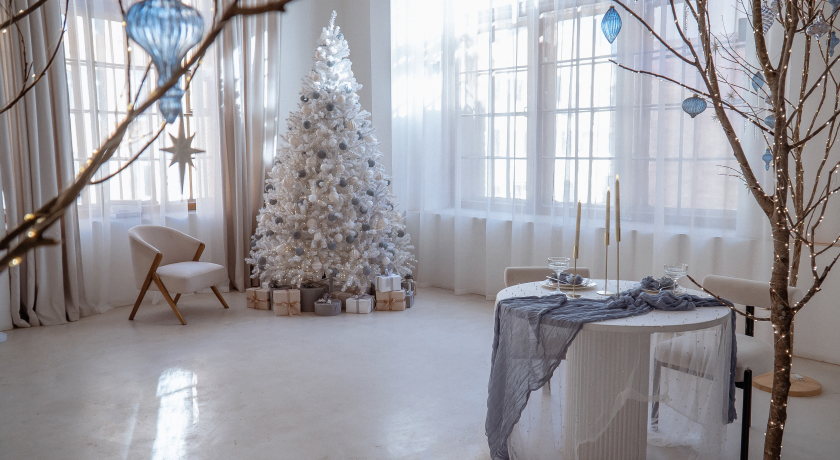 В новогоднем интерьере зала хотелось бы видеть больше атмосферных вещей. Например какую-нибудь посуду с отсылкой к празднику на большом столе.