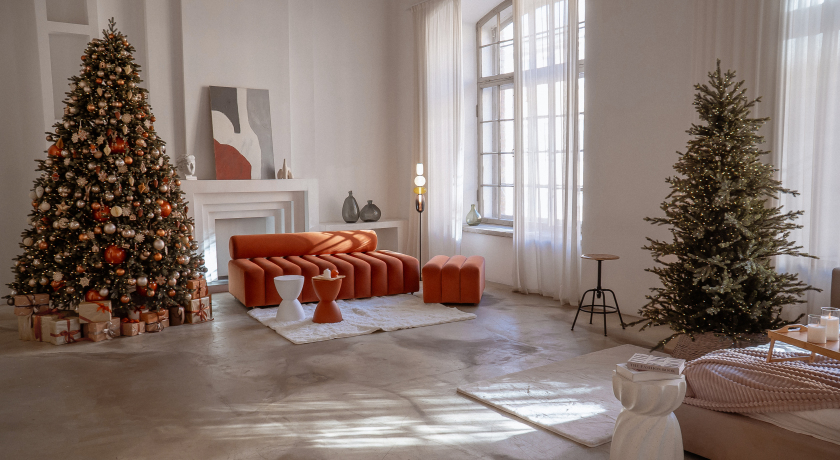 В новогоднем интерьере зала хотелось бы видеть больше атмосферных вещей. Например какую-нибудь посуду с отсылкой к празднику на большом столе.