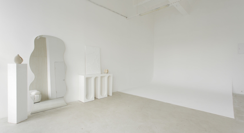 Много реквизита и мебели, ассиметричное зеркало в полный рост, стеклянный стол, белые пьедесталы