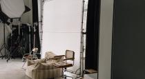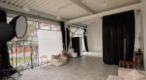 зал оснащен циклорамой,фонами,стеной пастельного оттенка и атрибутами для простых, но красивых кадров(стулья,большой бежевый диван)