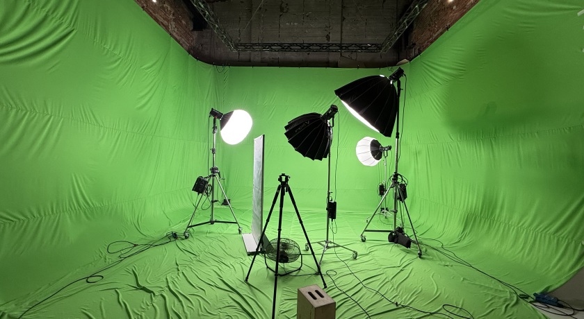 Зал «Хромакей» — просторная профессиональная студия 80 м² с трехсторонней тканевой хромакей-циклорамой и высотой потолков 6 метров. Габариты стен: 10 м / 7,6 м / 6 м, что позволяет свободно работать с крупными кадрами и сложными постановками.