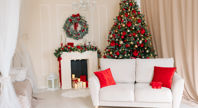 Кухонная зона, кровать, классический камин с диваном, украшенное окно и циклорама.