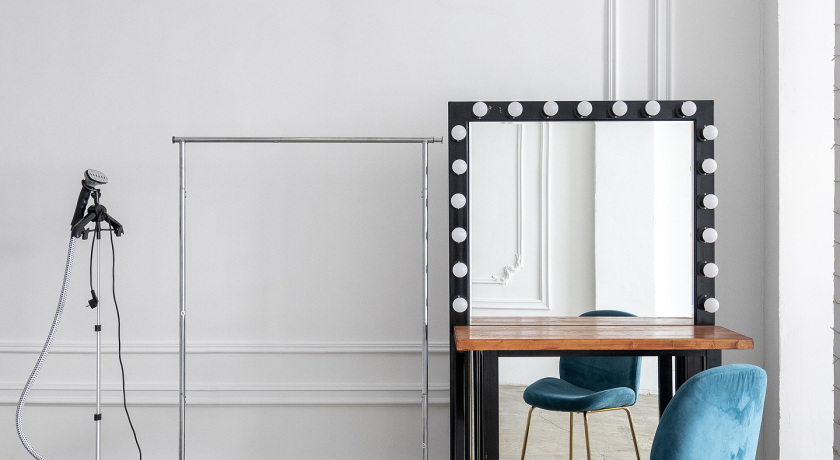 Для комфортной работы в зале имеется гримёрный стол и ростовое зеркало с подсветкой, вешало, отпариватель, музыкальная колонка.